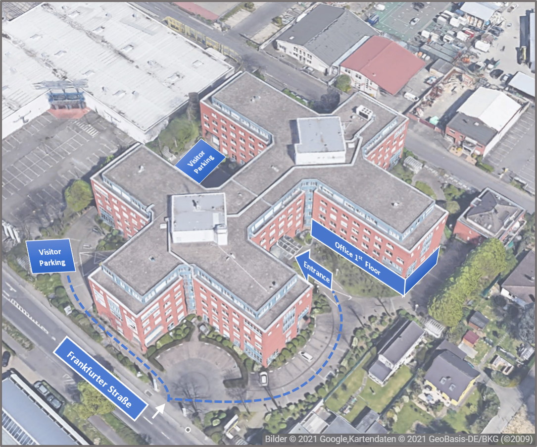 Directions You can find us at the Sirius Office Center in Cologne Porz-Eil. Frankfurter Straße 720-726 51145 Cologne Germany Please use one of the Hexagon parking spaces.